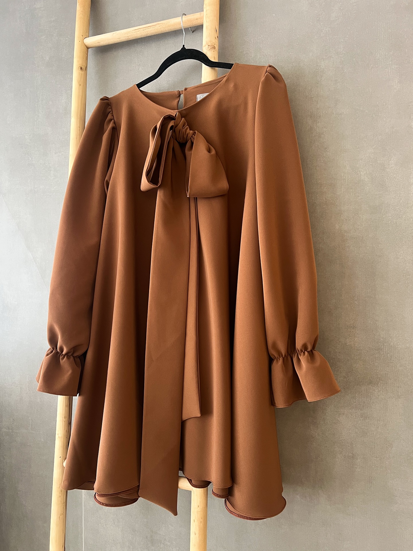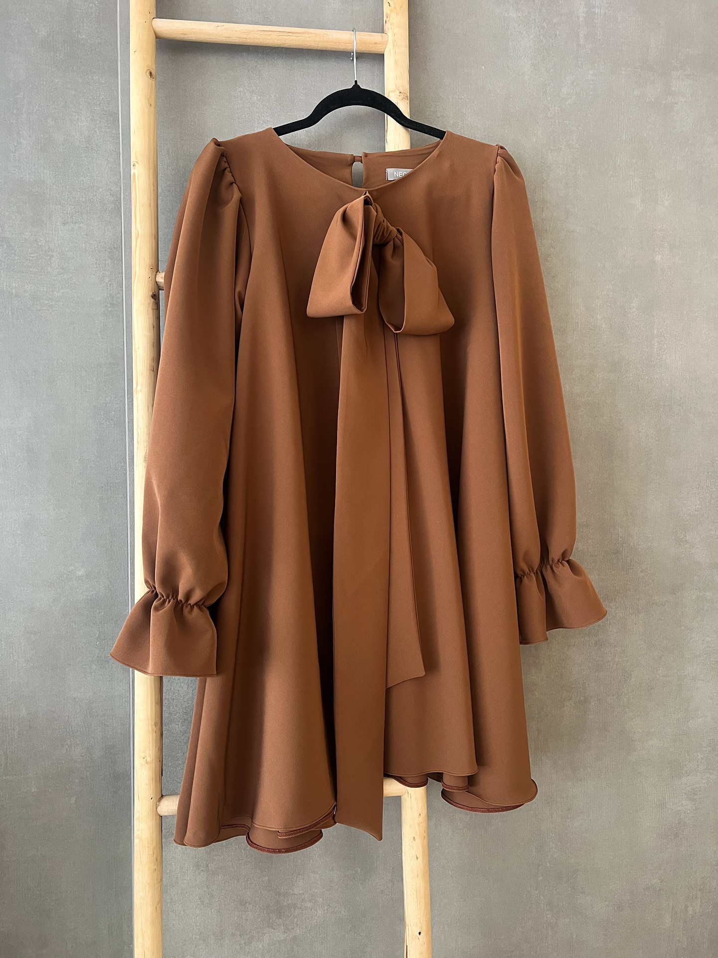 O vestido Zena é um modelo fluído com corte acentuado em A. Decote redondo e com laça